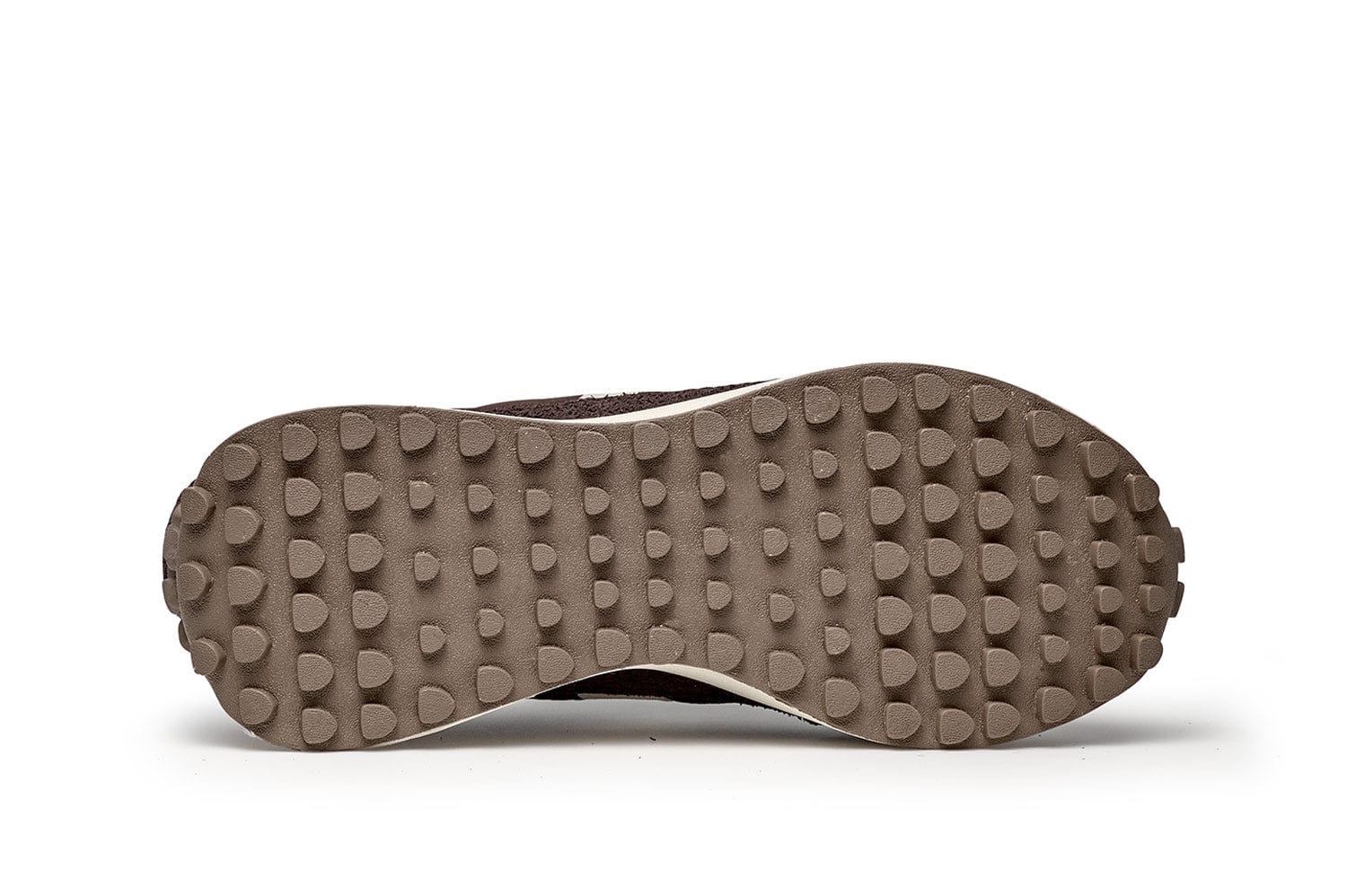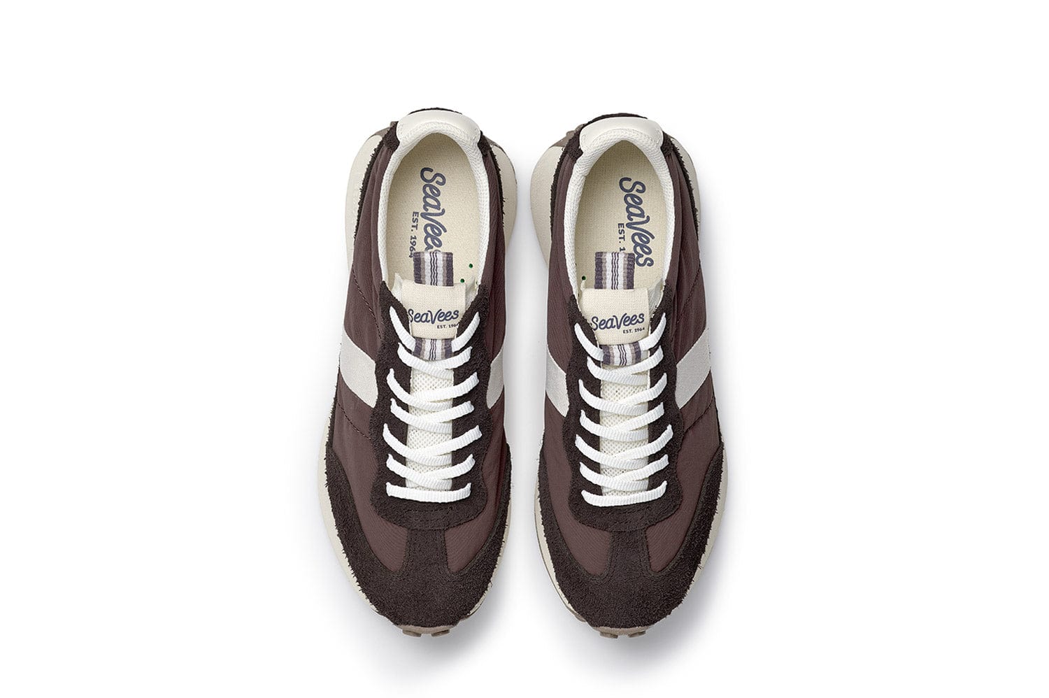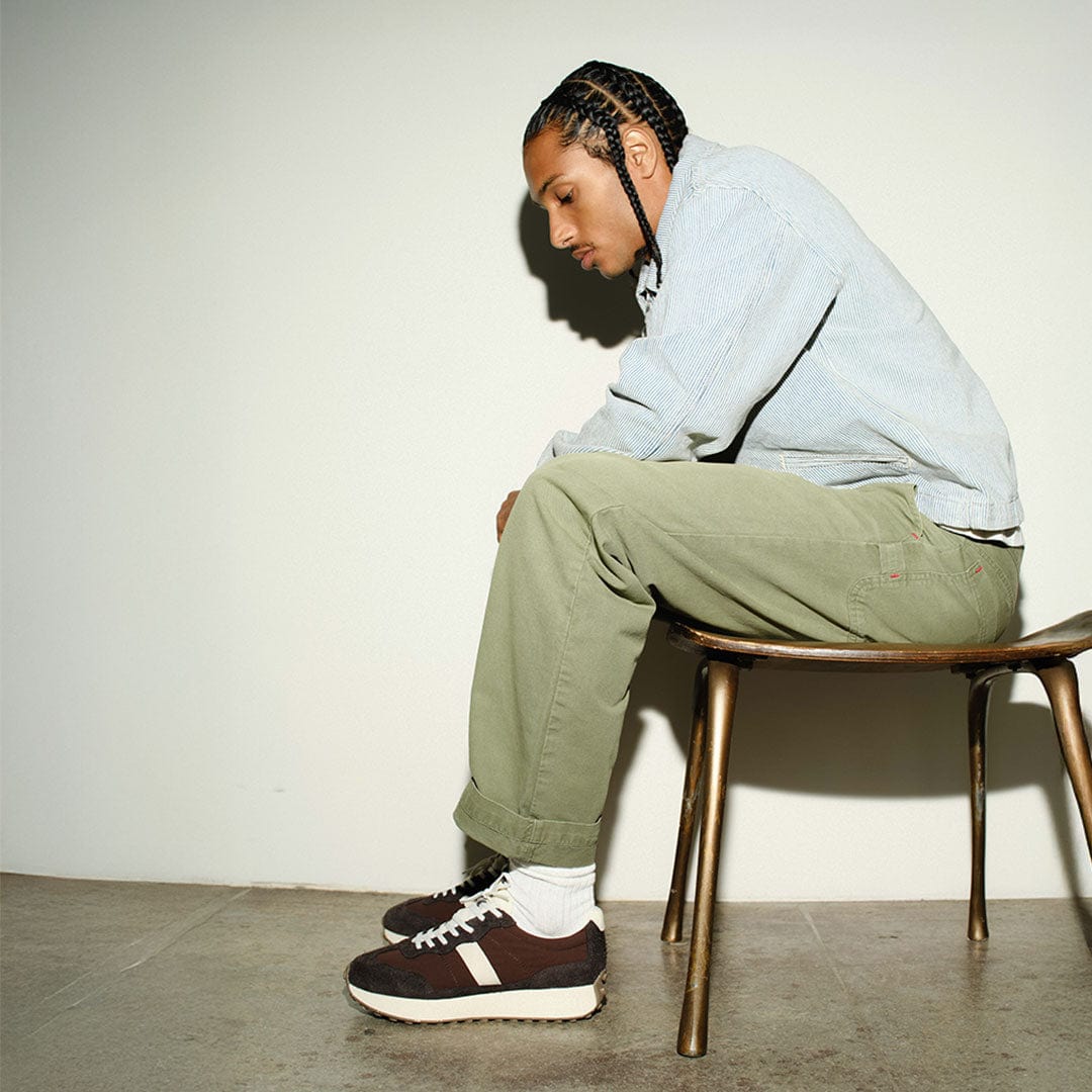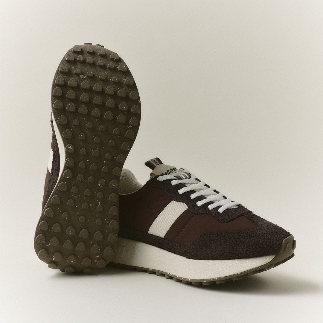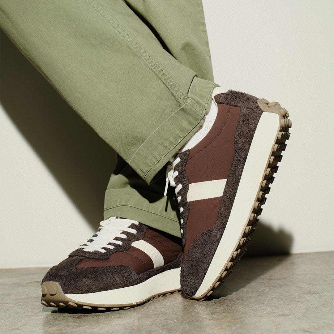 A '90s-inspired lightweight sporty trainer. Crafted with a sleek "high-to-low profile" silhouette and unique acorn treaded sole. A subtle hint to our brand logo inspired by California's iconic shaped highway signs. Finished with a pull tab featuring the same heritage webbing design as our shoes from the '60s.